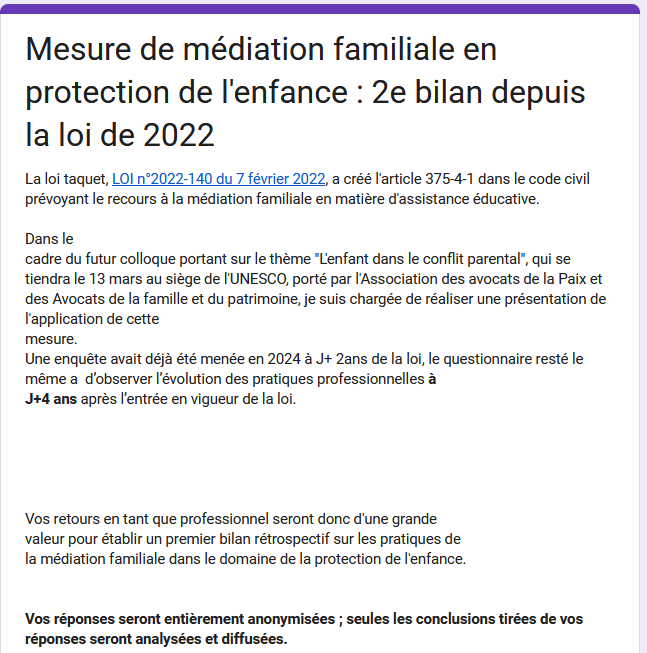 « En 2024, j’avais lancé, auprès des professionnels concernés, une première enquête relative à l’application de l’article 375-4-1 du code civil, issu de la loi n°2022-140 du 7 février 2022 (dite « loi Taquet »), introduisant le recours à la médiation familiale en matière d’assistance éducative.