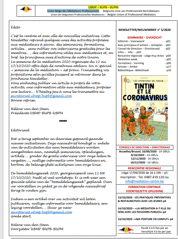 Le travail de préparation de Médiation 21 sur ces sujets a considérablement profité de la disponibilité et de la motivation de nombreux médiateurs pendant le confinement. Il est bien avancé sur de nombreux points, même si certains points-clés font encore l’objet de discussions animées. Encore une fois, il s’agit d’un travail et d’enjeux qui requièrent la construction de consensus et excluent donc toute précipitation.
