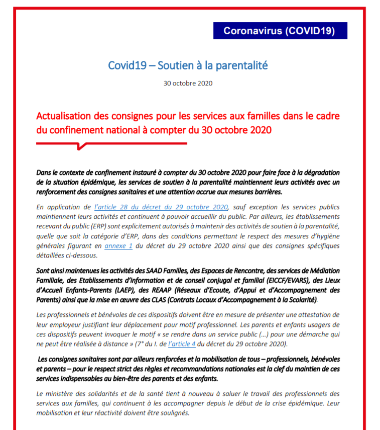Consignes à télécharger sur https://www.sdaesf01.fr/wp-content/uploads/2020/11/Covid19-Parentalite_Reconfinement-VF.pdf