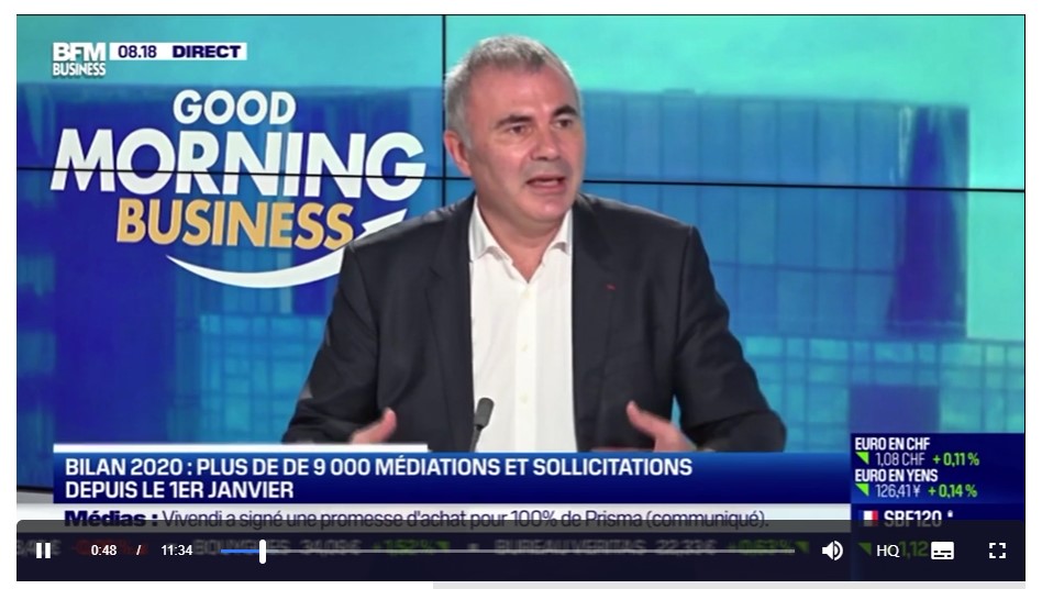 « Ce jeudi 24 décembre, Pierre Pelouzet, médiateur des entreprises, a dressé le bilan de la médiation des entreprises pour 2020, une année particulière et brutale, dans l’émission Good Morning Business présentée par Audrey Maubert. Good Morning Business est à voir ou écouter du lundi au vendredi sur BFM Business. (Exrait