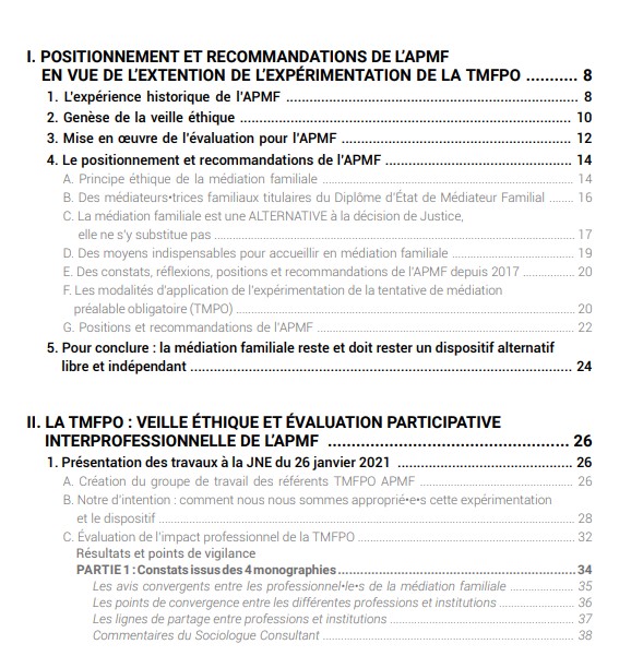 Depuis 30 ans, l’APMF conçoit l’éthique de pratique de médiation familiale, contribue à son développement, participe à sa meilleure connaissance et à sa reconnaissance auprès des pouvoirs publics, du grand public et des professionnel•le•s du champ juridique, social, médical, thérapeutique. Des médiateurs•trices familiaux, des étudiant•e•s, des employeurs se réunissent régulièrement au sein des commissions et des régions de l’APMF pour réfléchir aux enjeux de cette pratique spécifique, pour concevoir diverses modalités d’information, de rencontres et pour travailler ensemble aux divers dispositifs qui permettent la diffusion de la médiation familiale. La TMFPO a donc, naturellement, constitué un sujet d’attention pour que dans ce nouveau contexte législatif, la philosophie et le cadre de la médiation soient pris en considération par les différents acteurs impliqués : magistrat•e•s, avocat•e•s, professionnel•le•s du champ juridique, employeurs, financeurs et les pouvoirs publics. Ce rapport réunit différents travaux et réflexions. Il a été réalisé par des praticiens•ciennes de la médiation familiale accompagné•e•s par Nicolas LAURIOT DIT PREVOST, sociologue indépendant