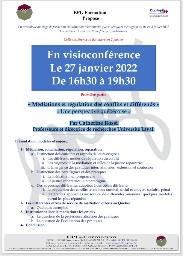 H.fr : Des situations dans le champ spécifique du handicap pour lesquelles il peut être conseillé de faire appel à un médiateur ? • Choix de vie à faire pour la personne en situation de handicap (institution, opération ou traitements médicaux, mesures d’incapacité…), • Choix de vie pour les proches (suspension de son activité professionnelle pour s’occuper de son enfant, gestion de la famille, organisation, prise en compte des efforts réalisés pour la personne en situation de handicap…), • Réflexion sur la prise en charge financière par la famille (quand l’un des deux cesse son activité pour s’occuper de son enfant, quand il faut payer certains biens comme un fauteuil roulant onéreux ou des travaux dans la maison pour permettre d’accueillir une personne invalide), • Renouement du dialogue entre des personnes que l’existence du handicap a pu éloigner. Parfois l’un des parents n’accepte pas la situation et préfère fuir. Revenir devient alors très compliqué. Le recours à la médiation familiale peut favoriser la reprise du dialogue au sein de la famille et permettre à chaque membre de parler de ses ressentis. » (Extrait de informations.handicap.fr du 14/12/2021)