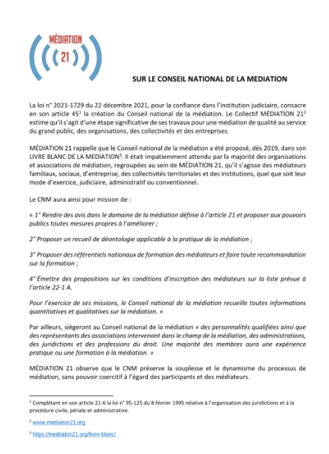 « Le collectif MEDIATION 21 est heureux de partager avec vous sa réflexion sur le futur Conseil National de la Médiation, issu du Livre Blanc de la Médiation et dont la loi du 22 décembre 2021 dite Loi pour la confiance dans l’institution judiciaire s’est emparée. Vos apports seront précieux pour nous. » (Extrait deinkedin.com)