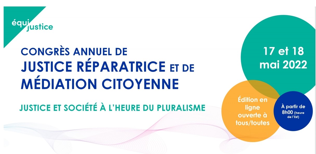 « Bienvenue au congrès annuel de justice réparatrice et de médiation citoyenne d’Équijustice. Cette année encore, notre réseau est fier de vous offrir un événement en ligne gratuit, ouvert à tous et toutes dans le but de démocratiser l’accès à la justice, de favoriser le partage des connaissances et de faire rayonner une certaine idée de la justice.