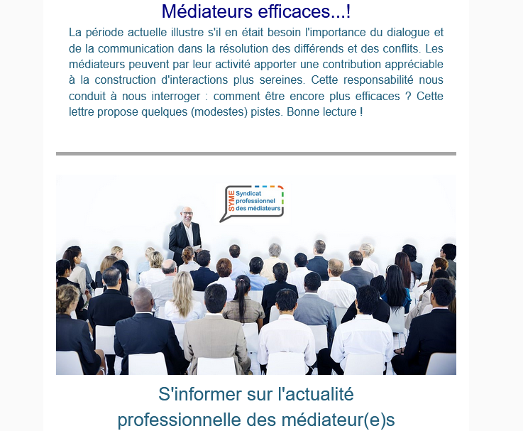 Dans l’entreprise et entre les entreprises, la médiation est déjà bien présente. Il y a le médiateur des entreprises, Pierre Pelouzet, qui est rattaché au ministère de l’Économie et des Finances. Il peut avec des médiateurs qu’il mandate réaliser des médiations lorsque des sociétés le saisissent. Il a été très sollicité notamment pendant la crise sanitaire. Au moment du Covid, la médiation sociale a permis à certaines personnes vivant dans les quartiers populaires de renouer le dialogue. Plus globalement, la médiation, processus structuré, confidentiel et volontaire, permet tout d’abord de s’expliquer. En discutant et en dialoguant, les parties vont trouver ensemble des solutions pour améliorer la situation et gérer leur conflit. Finalement, la médiation est présente dans toutes les strates de la société. Ce que j’apprécie dans la médiation c’est son universalisme. Aujourd’hui, certes, elle est connue. Beaucoup de choses sont faites. Mais en France, elle n’est pas encore pleinement exploitée. La médiation doit devenir un réflexe. Par exemple, elle ne doit pas être simplement la jambe de bois de la justice. Elle doit faire partie de la justice et apporter aux personnes des relations plus apaisées. » (Extrait de actu-juridique.fr du 18/10/2022)