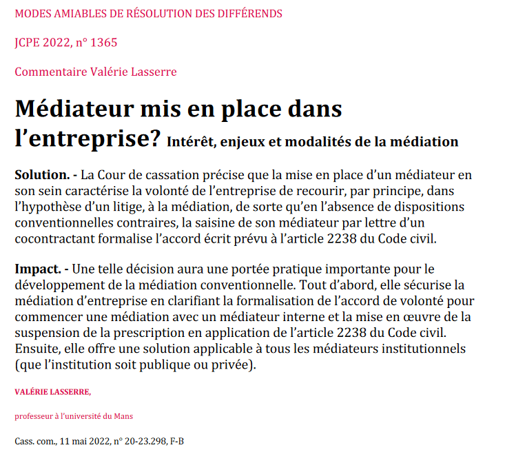 Par défaut Publié par Lettre des Médiations Publié le 1 décembre 2022 Publié sous accords de médiation, médiation travail commentaires Poster un commentaire Médiation travail : « Médiateur mis en place dans l’entreprise? Intérêt, enjeux et modalités de la médiation »JCPE 2022, n° 1365, Commentaire Valérie Lasserre, Université du Mans Extrait de https://www.linkedin.com/posts/association-nationale-des-mediateurs_un-nouvel-arr%C3%AAt-sur-le-m%C3%A9diateur-dans-lentreprise-activity-7002546303440150528–4DI/?utm_source=share&utm_medium=member_android En savoir plus sur Lettre des Médiations Abonnez-vous pour recevoir les derniers articles par e-mail. Saisissez votre adresse e-mail… Abonnez-vous Partager avec :lettre des médiations Cliquer pour imprimer(ouvre dans une nouvelle fenêtre) Imprimer Cliquer pour partager sur X(ouvre dans une nouvelle fenêtre) X Cliquez pour partager sur Facebook(ouvre dans une nouvelle fenêtre) Facebook Cliquer pour envoyer un lien par e-mail à un ami(ouvre dans une nouvelle fenêtre) E-mail Cliquez pour partager sur Reddit(ouvre dans une nouvelle fenêtre) Reddit Cliquez pour partager sur viadeo(ouvre dans une nouvelle fenêtre) viadeo Cliquez pour partager sur Tumblr(ouvre dans une nouvelle fenêtre) Tumblr Cliquez pour partager sur Pinterest(ouvre dans une nouvelle fenêtre) Pinterest Cliquez pour partager sur Pocket(ouvre dans une nouvelle fenêtre) Pocket Cliquer pour partager sur Mastodon(ouvre dans une nouvelle fenêtre) Mastodon Cliquez pour partager sur LinkedIn(ouvre dans une nouvelle fenêtre) LinkedIn Cliquez pour partager sur WhatsApp(ouvre dans une nouvelle fenêtre) WhatsApp Cliquer pour partager sur X(ouvre dans une nouvelle fenêtre) X Plus Cliquez pour partager sur Threads(ouvre dans une nouvelle fenêtre) Threads Cliquer pour partager sur Bluesky(ouvre dans une nouvelle fenêtre) Bluesky J’aime chargement… Similaire médiation Navigation des articles ← Article : « L’ethnicisation de la médiation sociale dans des “quartiers ghettos” – Non, la politique des « grands frères » n’est pas morte ! » par Manuel Boucher, Migrations Société 2012/2, N° 140, pages 25 à 34 Le tribunal de Lorient va tester la co-médiation pour régler les conflits familiaux qui s’éternisent → Laisser un commentaire Annuler la réponse. Δ Ce site utilise Akismet pour réduire les indésirables. En savoir plus sur la façon dont les données de vos commentaires sont traitées.