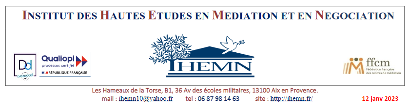 « L’Institut des Hautes Etudes en Médiation et Négociation propose aux personnes souhaitant devenir médiateur ou négociateur un parcours complet, comprenant une formation de base (60 h) et une formation d’approfondissement (160h).