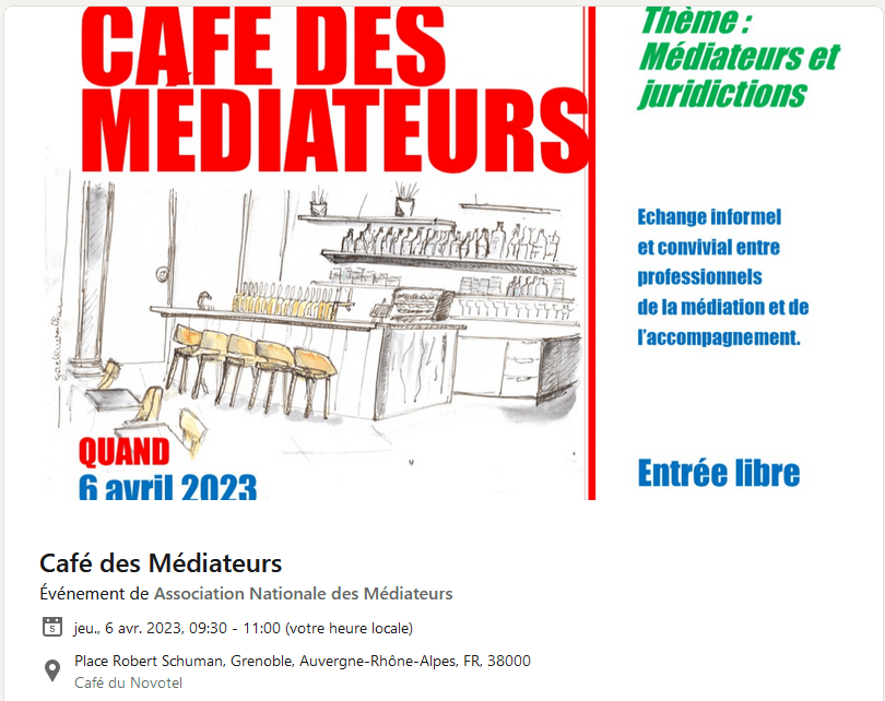Rencontre et échanges informels entre professionnels du droit et de l’accompagnement sur le thème : la médiation et les juridictions et magistrats – Les listes de médiateurs agréés par les tribunaux. Entrée libre