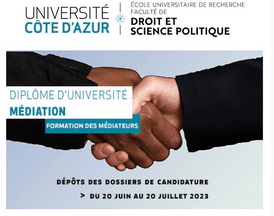 « Avec le Diplôme d’Université de Médiation, la Faculté de Droit et Science politique d’Université Côte d’Azur entend se placer au centre de l’action de la formation des médiateurs, en proposant une formation de référence et d’excellence académique répondant aux attentes européennes, nationales et des secteurs professionnels pour s’adapter aux enjeux contemporains et à l’essor des missions de médiation.