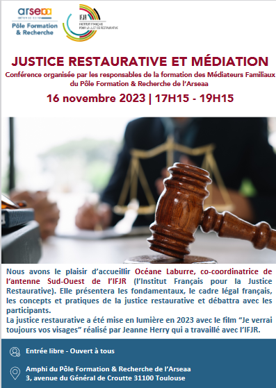 Conférence-débat : « JUSTICE RESTAURATIVE ET MEDIATION », Institut Français pour la Justice Restaurative et Pôle Formation & Recherche de l’Arseaa, 16 novembre 2023 à 17h15, Toulouse