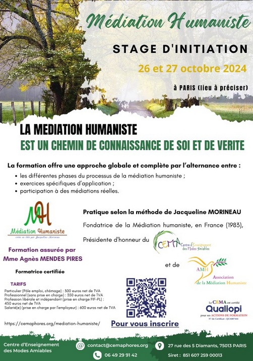 La dernière séance est dédiée à l’analyse de pratiques à partir de cas concrets apportés par les participants. Vous aurez l’opportunité de revisiter les outils étudiés au cours du programme et de participer à une session d’intervision, essentielle pour le développement continu de vos compétences en médiation. » (Extrait de afim-mediation.com
