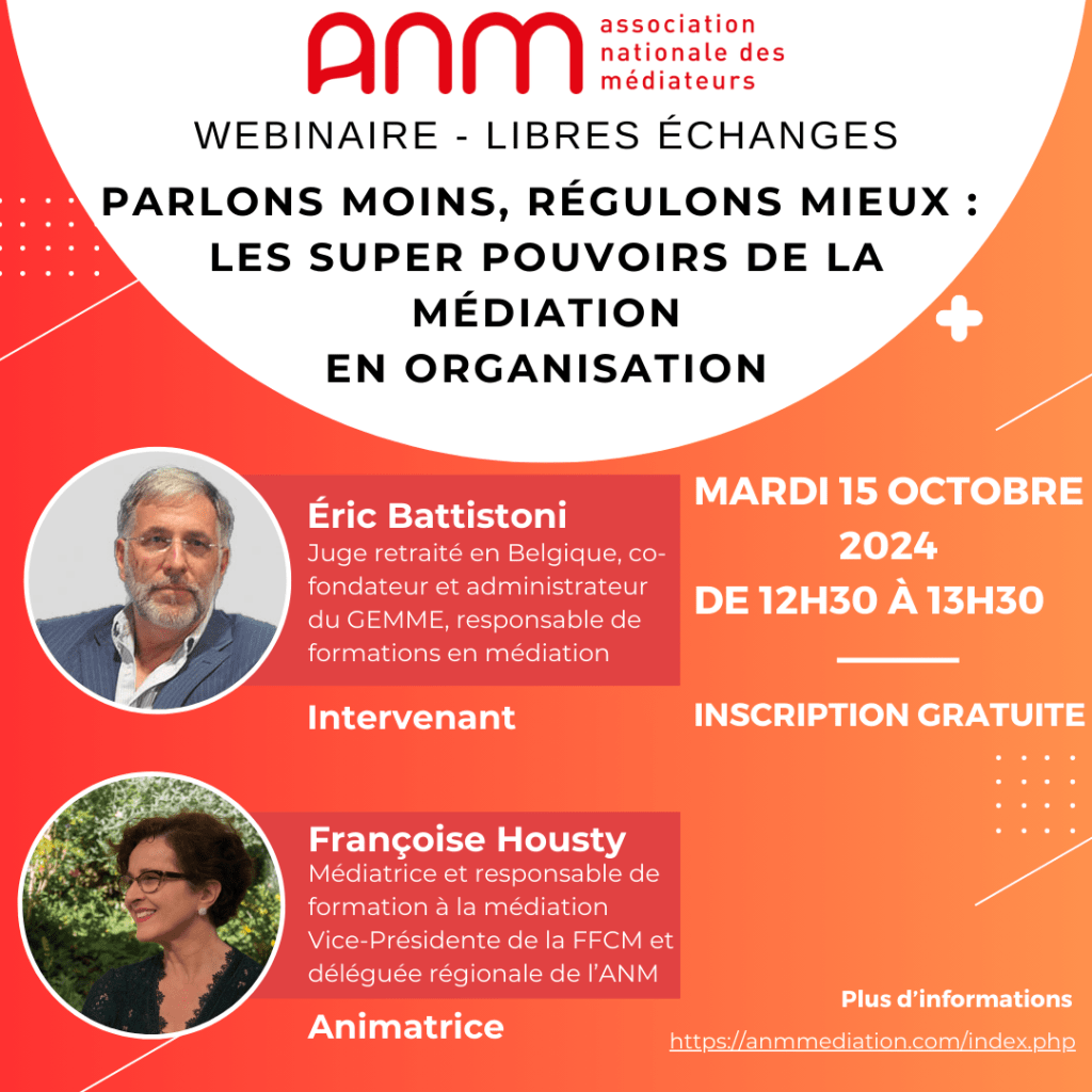 « Ce webinaire prendra la forme d’un échange entre l’intervenant et l’animateur autour des multiples apports de la médiation au sein des organisations. Qu’il s’agisse d’une entité publique ou d’une entreprise, la médiation est une véritable « vitamine » qui permet d’y favoriser l’harmonie et ainsi d’augmenter sa performance ! Les participants ne manqueront pas, par leurs expériences croisées en la matière, de livrer les secrets d’une implantation réussie de la médiation dans les organisations.