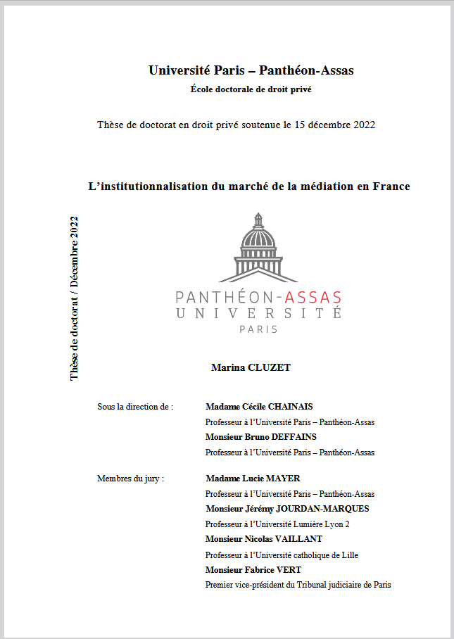 « La résolution des conflits constitue un besoin impérieux auquel toute société se doit d’apporter une réponse. Plusieurs voies sont proposées aux citoyens, parmi lesquelles l’accès à un juge qui fait figure, en France, de voie royale. Certes, la médiation apparaît comme une voie naturelle de résolution des différends, propre à pallier les insuffisances du procès. Pourtant, la voie juridictionnelle demeure privilégiée en France alors même qu’elle n’est pas, en soi, la plus efficace sur un plan économique. La présente thèse s’attache à identifier les causes et conséquences de ce qui apparaît ainsi comme une véritable tendance culturelle. La thèse démontre que le marché de la médiation se caractérise, en France, par un état relatif de sous-développement. Depuis la loi n° 95-125 du 8 février 1995, la médiation ne rencontre pas le succès escompté. L’étude montre que cet état de fait trouve sa source dans les défaillances plurielles du marché de la médiation, qui freinent son développement. Prenant appui sur une analyse transdisciplinaire du marché de la médiation, il sera démontré que l’institutionnalisation du marché de la médiation – préalable à un renversement de paradigme culturel – est nécessaire pour permettre l’essor de la médiation. La thèse plaide, en conséquence, pour une intervention étatique en la matière. Au-delà de l’intervention directe de l’Etat, elle suggère d’encourager les acteurs présents sur le marché de la médiation à favoriser la demande et à sécuriser l’offre de médiation. C’est à cette aune qu’est analysée, dans le cadre d’une démarche microéconomique, la mise en place inédite d’un dispositif interne de médiation au sein de la société Air France. » (Extrait)