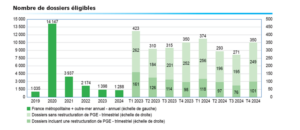 « En 2024, 1288 dossiers ont été éligibles à la médiation du crédit, un niveau confirmant la normalisation des saisines amorcée en 2022 avec un retour à des volumes comparables à ceux observés avant la crise sanitaire. Parmi ces demandes, 392 ont porté sur des restructurations de Prêts Garantis par l’État (PGE) prévues dans le cadre de l’Accord de place spécifique (signé début 2022 et prolongé jusqu’à fin 2026), soit un recul de 22% par rapport à l’année précédente. »