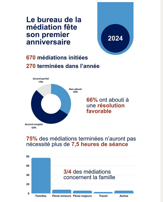 « Après une année d’existence, le Pouvoir judiciaire de la République et canton de Genève peut d’ores et déjà dresser un bilan prometteur de l’activité du bureau et de son impact positif en matière de résolution amiable des conflits. En 2024, 670 médiations ont été initiées dans le cadre du nouveau dispositif et prises en charge financièrement par le Pouvoir judiciaire de la République et canton de Genève. 270 se sont terminées la même année et quelque 66% d’entre elles ont abouti à un accord. » (Extrait)