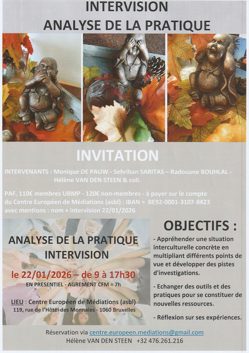 Par défaut Publié par Lettre des Médiations Publié le 16 janvier 2026 Publié sous formation à la médiation, médiation Belgique commentaires Poster un commentaire Belgique : « Intervision-Analyse de la pratique, » par le Centre Européen de la Médiation, à Bruxelles, le 22/01/2026 En savoir plus sur Lettre des Médiations Abonnez-vous pour recevoir les derniers articles par e-mail. Saisissez votre adresse e-mail… Abonnez-vous Partager avec :lettre des médiations Imprimer(ouvre dans une nouvelle fenêtre) Imprimer Partager sur X(ouvre dans une nouvelle fenêtre) X Partager sur Facebook(ouvre dans une nouvelle fenêtre) Facebook Email a link to a friend(ouvre dans une nouvelle fenêtre) E-mail Partager sur Reddit(ouvre dans une nouvelle fenêtre) Reddit Partager sur viadeo(ouvre dans une nouvelle fenêtre) viadeo Partager sur Tumblr(ouvre dans une nouvelle fenêtre) Tumblr Share on Pinterest(ouvre dans une nouvelle fenêtre) Pinterest Share on Pocket(ouvre dans une nouvelle fenêtre) Pocket Share on Mastodon(ouvre dans une nouvelle fenêtre) Mastodon Share on LinkedIn(ouvre dans une nouvelle fenêtre) LinkedIn Partager sur WhatsApp(ouvre dans une nouvelle fenêtre) WhatsApp Partager sur X(ouvre dans une nouvelle fenêtre) X Plus Share on Threads(ouvre dans une nouvelle fenêtre) Threads Partager sur Bluesky(ouvre dans une nouvelle fenêtre) Bluesky J’aime chargement… Similaire médiation Navigation des articles ← La négociation collective en 2024 (Publication du bilan annuel, par la DGT et la DARES) présentation par Christian Thuderoz ( thdz-negociationcollective.org) La médiation, un outil pour apaiser le climat scolaire (expressions-venissieux-fr.) → Laisser un commentaire Annuler la réponse. Δ Ce site utilise Akismet pour réduire les indésirables. En savoir plus sur la façon dont les données de vos commentaires sont traitées.