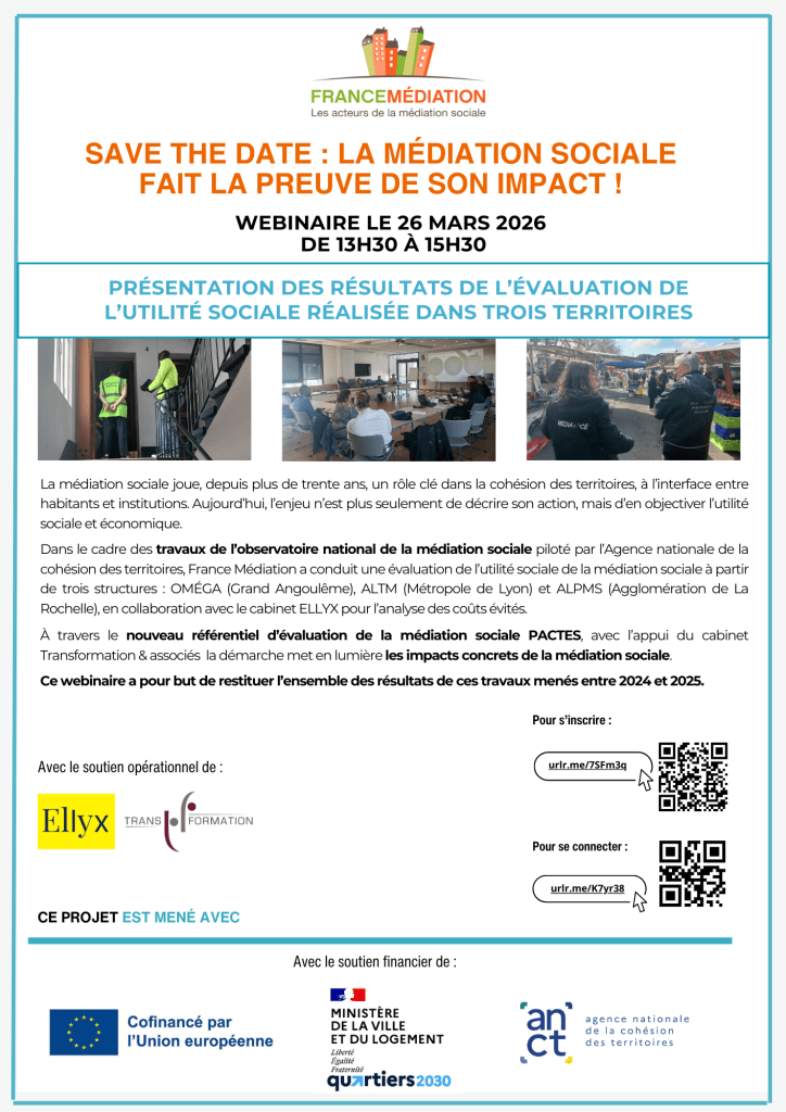 « Dans le cadre des travaux de l’observatoire national de la médiation sociale piloté par l’Agence nationale de la cohésion des territoires, France Médiation a conduit une évaluation de l’utilité sociale de la médiation sociale à partir de trois structures : OMÉGA (Grand Angoulême), ALTM (Métropole de Lyon) et ALPMS (Agglomération de La Rochelle), en collaboration avec le cabinet ELLYX pour l’analyse des coûts évités.