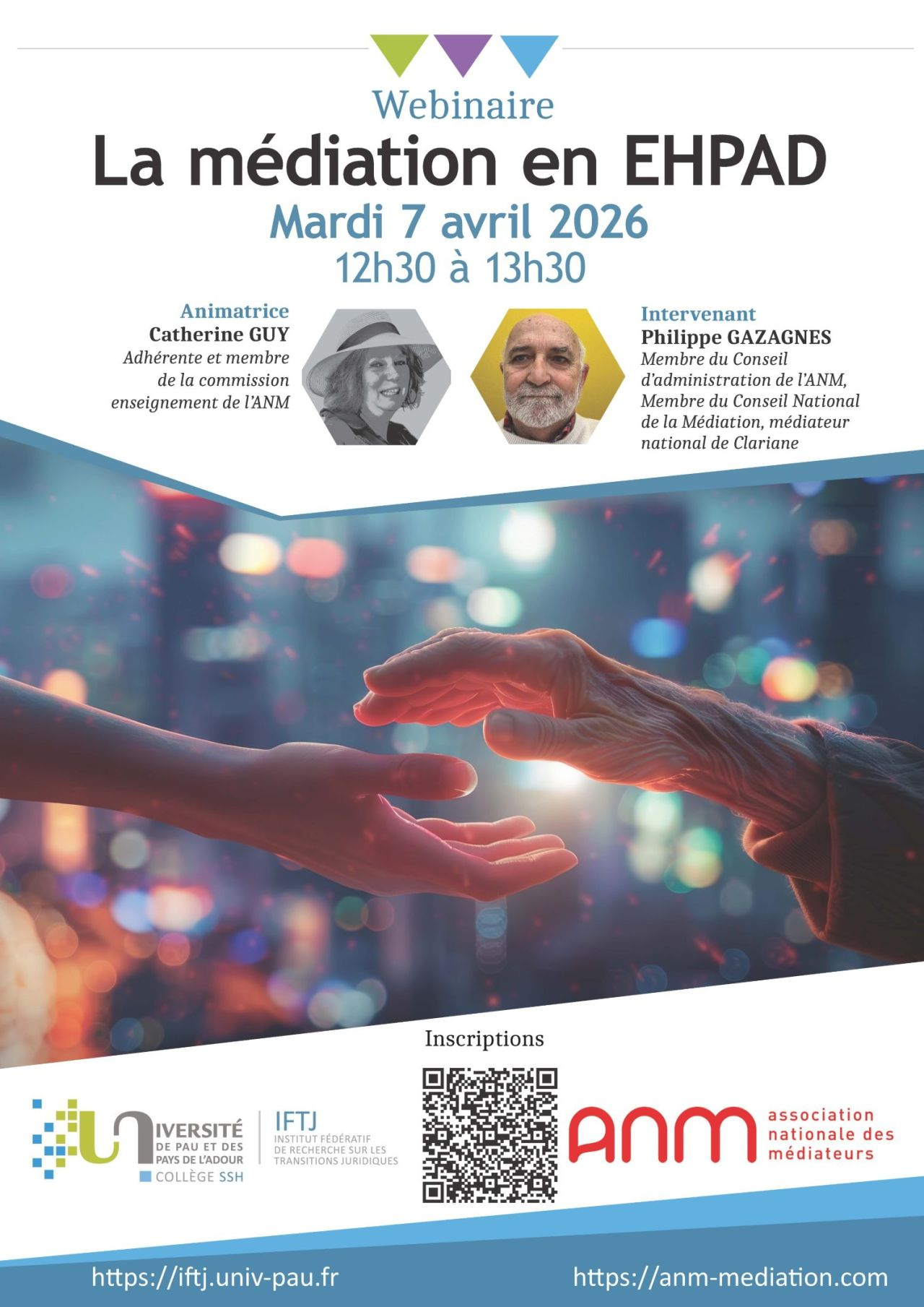 Webinaire proposé dans le cadre du cycle de webinaires coordonnés par Dominique Weber, Présidente de l’Association Nationale des Médiateurs et Cédric EDOUARD, Vice-Président de l’ANM et Maître de conférences en droit privé à l’Université de Pau et des Pays de l’Adour.