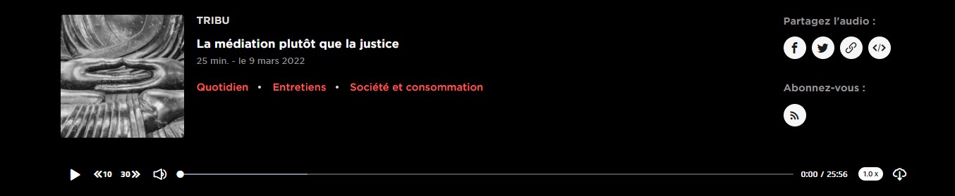 A écouter sur https://www.rts.ch/audio-podcast/2022/audio/la-mediation-plutot-que-la-justice-25806790.html