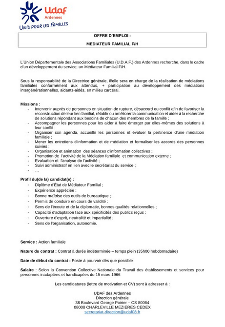 Master dans un domaine utile à la fonction complété par une formation en médiation et gestion de conflit.