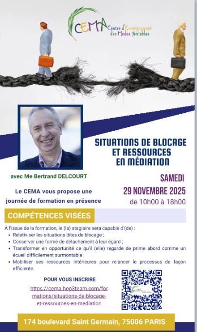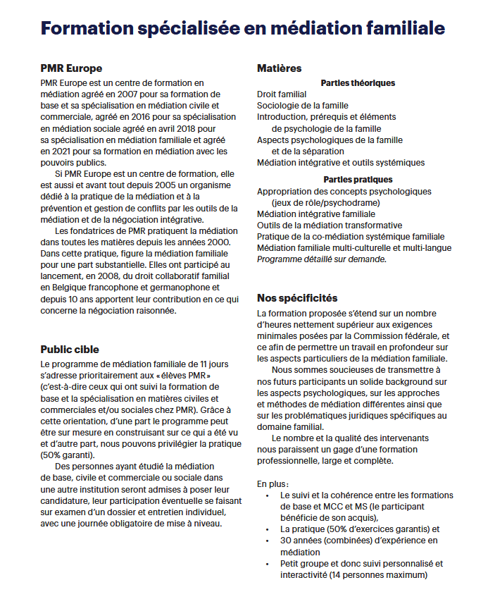 ✅ Certificat en Médiation générale, pour acquérir les bases théoriques et pratiques essentielles ✅Certificat en Médiation civile, commerciale et sociale, pour se concentrer sur les conflits entre particuliers, entre entreprises et associations, ainsi que les relations de travail ✅Certificat en Médiation familiale, pour aborder les enjeux conjugaux, intergénérationnels et successoraux ✅Certificat en Médiation locale, scolaire, pénale et soins de santé, pour s’adapter à des contextes institutionnels