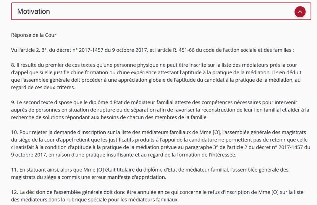 Commet une erreur manifeste d’appréciation l’assemblée générale des magistrats du siège qui rejette, en raison d’une pratique insuffisante et au regard de la formation de l’intéressé, la demande d’inscription sur la liste des médiateurs, dans la rubrique spéciale pour les médiateurs familiaux, d’un candidat titulaire du diplôme d’Etat de médiateur familial »