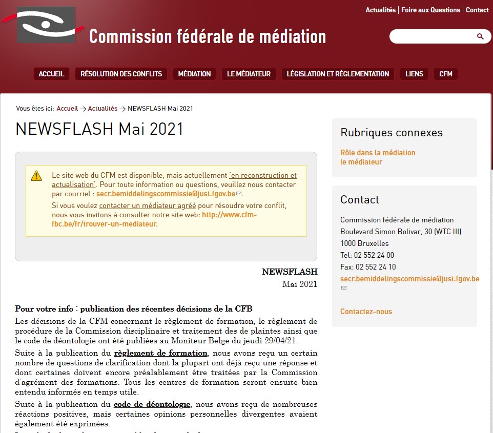 Les décisions de la CFM concernant le règlement de formation, le règlement de procédure de la Commission disciplinaire et traitement des de plaintes ainsi que le code de déontologie ont été publiées au Moniteur Belge du jeudi 29/04/21.