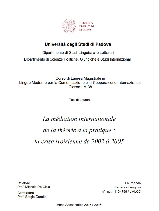 Le sujet du présent mémoire est la médiation dans la vie politique et internationale et notamment son utilisation dans la crise ivoirienne. Le choix de ce sujet dérive essentiellement de mon intérêt personnel qui m’a toujours amenée vers des projets ambitieux à vocation internationale, et en même temps du désir d’être cohérente avec mon cours de master intitulé Lingue moderne per la cooperazione e comunicazione internazionale (Langues étrangères pour la communication et la coopération internationale). Le sujet de la médiation est très intéressant pour moi et je crois que pour la société mondiale, devant tous les conflits qui surgissent actuellement, la médiation est la meilleure solution pour tous les pays qui veulent agir avec diplomatie plutôt que par des règlements armés. Mettre en évidence des carences que la médiation a mises en évidence, comme je l’ai fait dans mon étude de cas, pourrait être utile pour éviter les mêmes erreurs des chefs d’État, des organisations, pour améliorer l’information des médias qui joignent le public et enfin pour améliorer l’implémentation de ce processus lors d’une autre crise internationale. Tout cela uni à la passion vive, peut-être de contribuer un jour au travail dans ce domaine et dans ces territoires, c’est l’objectif qui accompagne ce travail. Toujours passionnée de culture française, j’estime la culture de l’Afrique francophone extrêmement enrichissante et hétérogène, surtout grâce (ou à cause) de son passé colonial et de son rapport ancien et controversé avec la France. J’ai donc choisi exprès, parmi les autres, un Pays qui a eu, pour beaucoup d’années, un lien étroit et positif avec l’ancienne puissance coloniale, la Côte d’Ivoire. Ce lien s’est complètement transformé lorsque la France a décidé de s’engager dans une guerre civile née au début d’un problème de haine raciale, et qui a ensuite évolué dans une crise internationale qui a déstabilisé une région entière. (Extrai)
