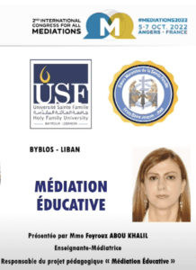 « Bonjour à tous. Je suis Fayrouz ABOU KHALIL. Je n’ai malheureusement pas pu être présente avec vous aujourd’hui. Malgré tout, je souhaitais vous partager la transformation que la médiation éducative a opérée sur moi en tant qu’enseignante. En 2019, je me suis inscrite au diplôme universitaire de médiation éducative, organisé par l’Université Sainte Famille (USF), avec le Centre d’enseignement des modes amiables (CEMA). En deux ans, j’ai suivi 360 heures de formation. Et je dois dire qu’il y a un avant et un après. Cette formation à la médiation éducative m’a transformée comme je ne l’aurai jamais imaginé. Avant, comme toute enseignante, je cherchais toujours à donner le meilleur de moi-même à mes élèves, être à l’image de la bougie ; la bougie qui éclaire le chemin des autres. Mais est-ce que le meilleur pour moi est nécessairement le meilleur pour mes élèves ? » (Extrait de hermes-mediation.fr/du 6/11/2022)