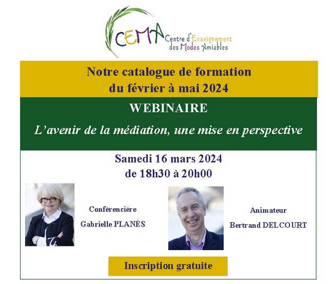 « 1er Webinaire pour l’année 2024 avec Gabrielle PLANES « L’avenir de la médiation, une mise en perspective », samedi 16 mars 2024 à 18h30. Bertrand DELCOURT animera ledit Webinaire ». (Extrait cemaphores.org)