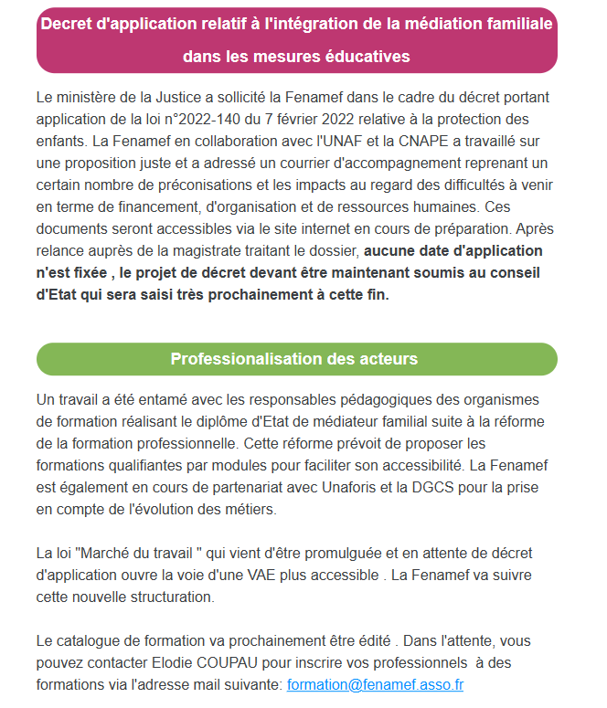 « Les espaces familiaux (services de médiation familiale et espaces de rencontre) ont pour vocation de travailler la question du lien et de l’altérité dans des situations où le conflit vient mettre en péril la communication à l’Autre et la relation à l’enfant. Dans leurs pratiques quotidiennes, les médiateurs familiaux et, a fortiori, les accueillants d’Espace Rencontre sont confrontés à des familles pour lesquelles les conflits à l’œuvre sont, bien souvent, de très forte intensité et pour lesquelles des violences sont alléguées voire mises en acte. Depuis le Grenelle contre les violences faites aux femmes et aux enfants, de nouvelles dispositions ont vu le jour. Alors que le nouveau référentiel relatif aux Espaces Rencontre s’est adapté à de nouveaux modes de prise en charge, la loi du 30 juillet 2020 est venue apporter du trouble parmi les professionnels de la médiation familiale qui ont interrogé la Fédération sur leur légitimité à intervenir auprès de familles lorsqu’il y a des allégations de violences. » (Extrait)
